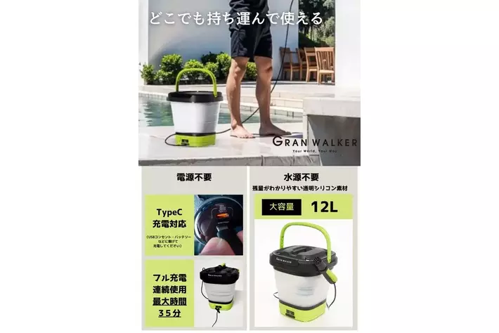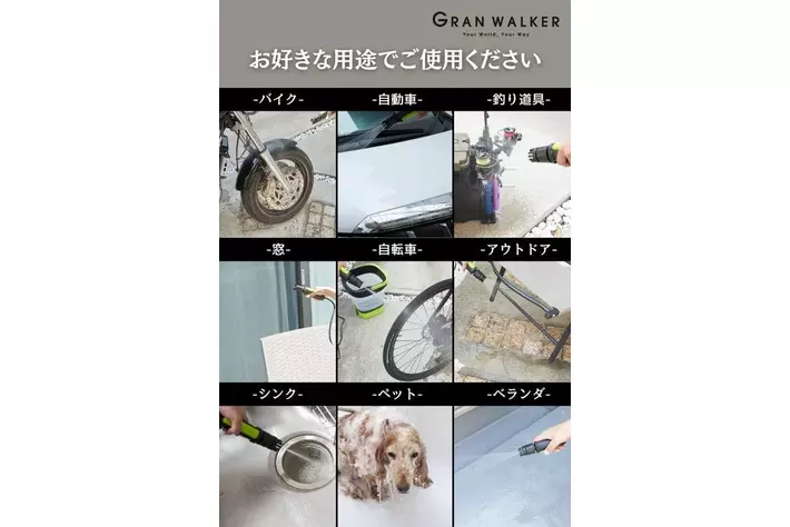 これまでの高圧洗浄機は、電源と水道が必須で、さらに使い終わった後の収納に手間がかかりました。しかし、「グランウォーカー マルチクリーナー ポータブルジェット」は、USB充電と水道ホース不要を実現し、従来の制約を完全に取り払いました。キャンプや洗車、ベランダ掃除、お墓掃除など、どんな場所でも場所を選ばず活用できる次世代の洗浄機です。■コンパクトで持ち運びラクラク