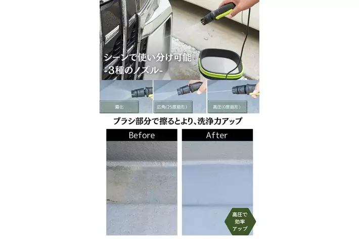 高圧、広角、霧化の3種類のノズルを搭載し、愛車の洗車から花壇や網戸の掃除まで、多用途に対応します。これ1台で家中の掃除が簡単に行え、外回りやベランダ、車のメンテナンスにも最適です。■ユーザーにも優しい設計