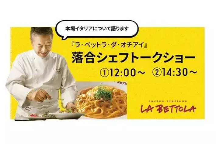 そしてイベントのハイライトは、予約の取りにくい店で有名な東京・銀座イタリア料理店「ラ・ベットラ・ダ・オチアイ」の落合務シェフによるイタリアにちなんだトークショー。当日はサイン入り書籍やウニのスパゲッティ、プリン、ラザニアなどを販売いたします。