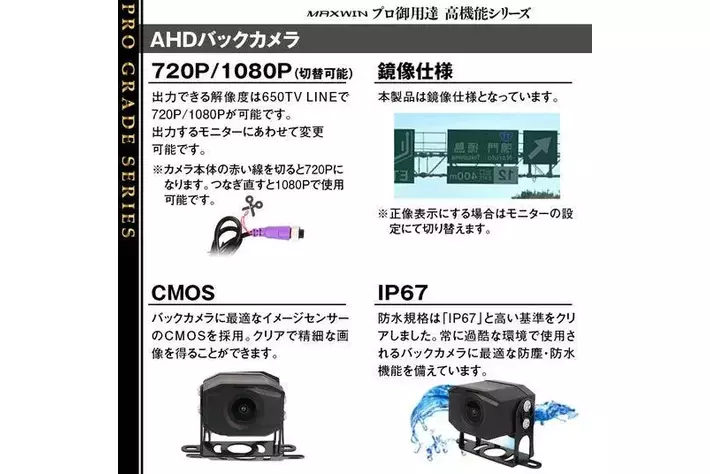 解像度の720P/1080Pが切り替え可能!安心のIP67防水防塵バックカメラ