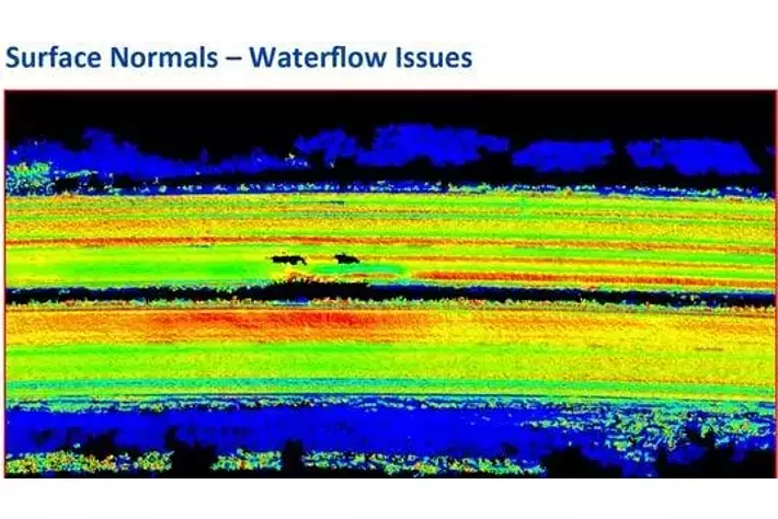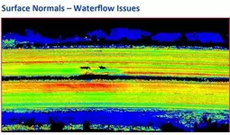 Terrasolidのソフトウェアにおける当社データのユースケース(道路上の斜面を色分けし、流水状況を表したもの)