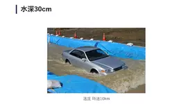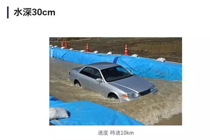 冠水時、時速10km・水深30cmの場合、クルマは走行できるか等をテストしています。