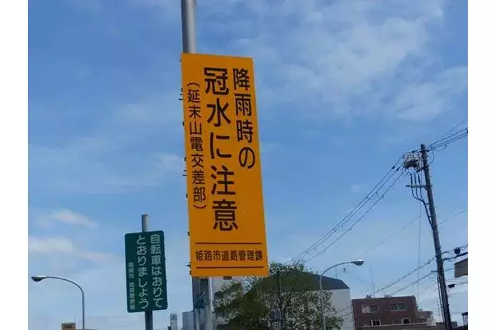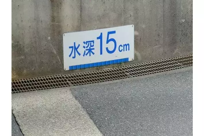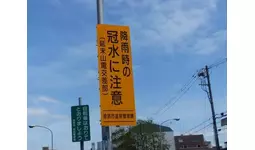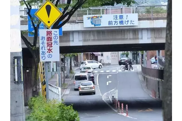 アンダーパスとは、交差する鉄道や道路などの下を通過するため、周辺の地面よりも低くなっている道路のことをいいます。アンダーパスは降雨時に雨水が溜まりやすく冠水する危険性が高いため、写真のような注意喚起の標識が道路脇に設置されています。
