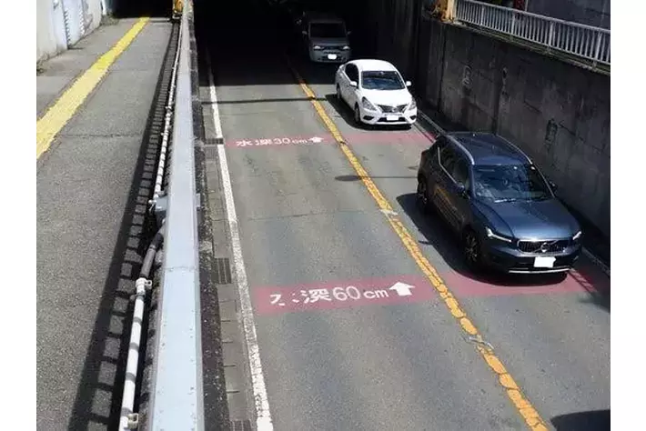JAF(一般社団法人日本自動車連盟)兵庫支部(支部長 長手 繁)は、集中豪雨などの悪天候に備えて、道路のアンダーパス走行時の注意を呼びかけています。日頃からクルマを運転する際には、このような標識、路面標示に十分注意し、豪雨時には不急の外出は控え、運転を避けることも重要です。