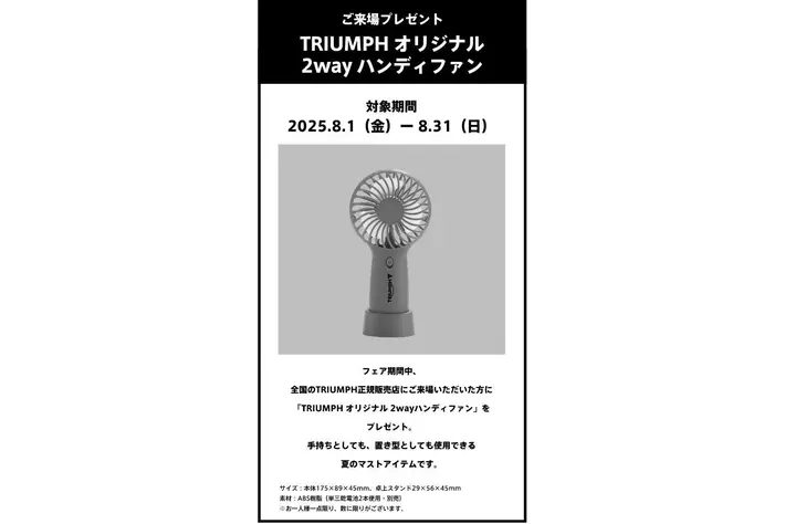 期間中、全国のTRIUMPH正規販売店にてご来場された方に、「TRIUMPH オリジナル 2way ハンディファン」をプレゼントいたします。