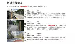 下図は坂道別の実測データです。T600GRは最も急激な三分坂ですら85kgのスタッフが乗車して19km/hの速度で登りきることができました。