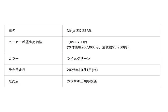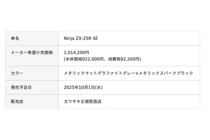 株式会社カワサキモータースジャパン(本社:兵庫県明石市、代表取締役社長:佐伯 健児)は、「Ninja ZX-25R SE」のカラー&グラフィックを変更し、2025 年10月1日(水)に発売いたします。また、特別な装備を備えた「Ninja ZX-25RR」を日本市場へ初めて導入。同日2025 年10月1日(水)より新発売いたします。