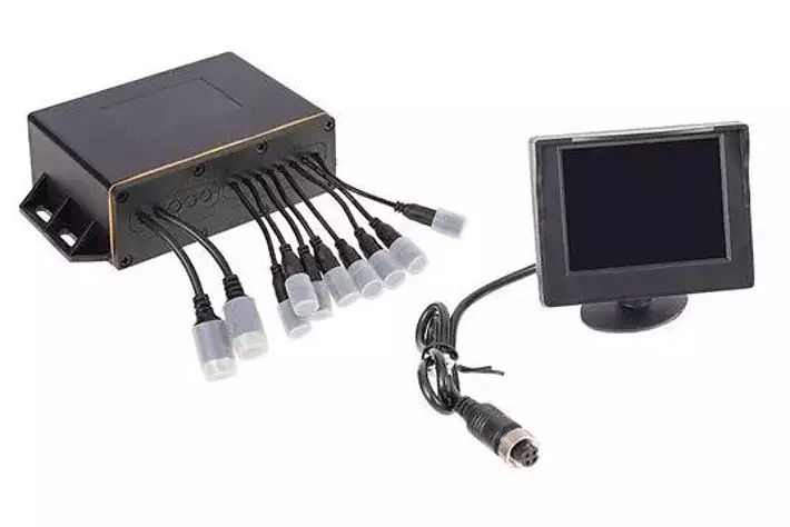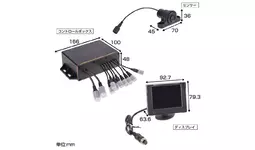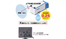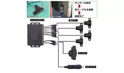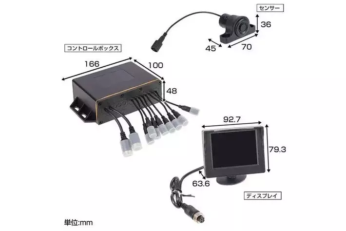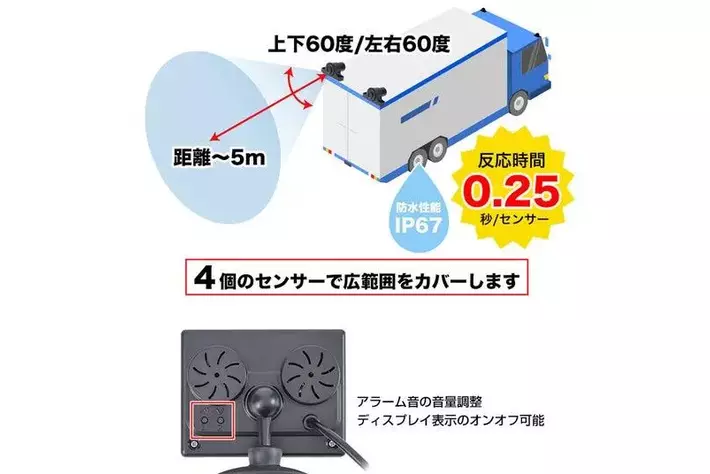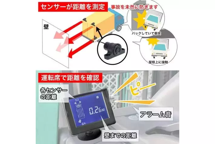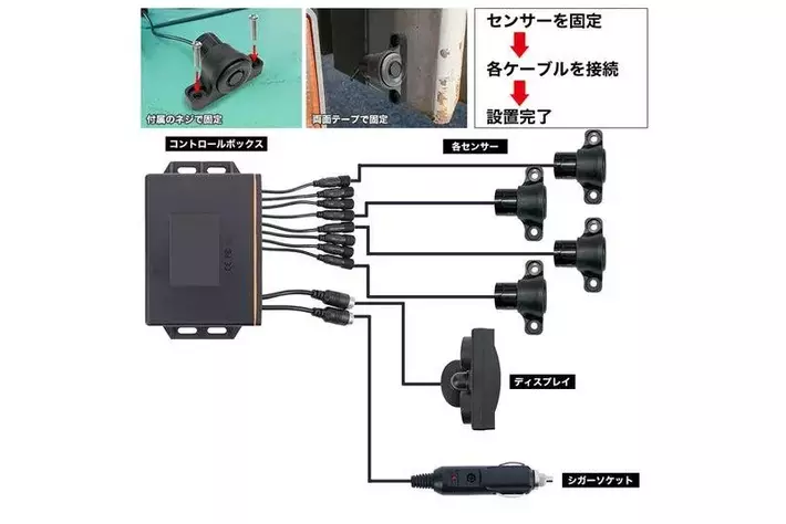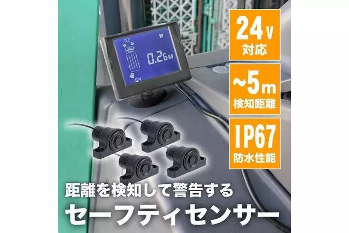 本製品はトラックやフォークリフト、普通自動車に4つのセンサーを取り付けて使用する、超音波式のバックセンサーです。