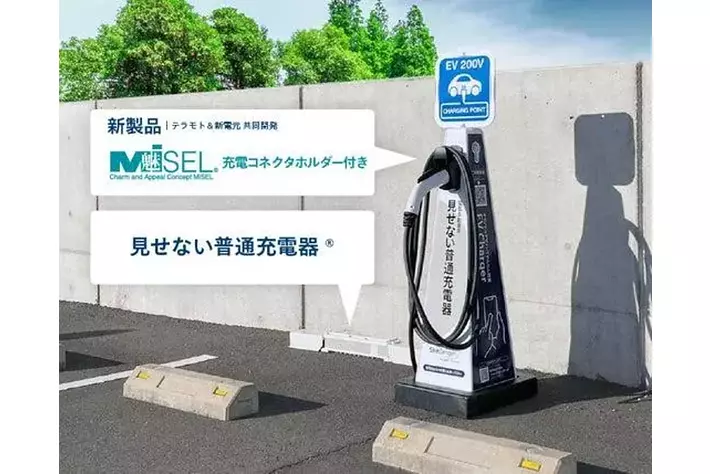 テラモト製「MISELメッセージポール-EV充電コネクタホルダー付き」は、オリジナルデザインが可能なおしゃれなメッセージポールの新展開製品です。テラモトは、これまで灰皿付き、消毒容器台付き、パネル型など豊富なメッセージポールを販売して参りましたが、この度、新電元製「見せない普通充電器」をより便利で柔軟に運用できるアイテムとして、ポール型EV充電コネクタホルダーをラインナップ追加しました。当社製「見せない普通充電器」は、壁面のほか床面や天井にも固定できるコンパクトな6kW出力のEV用普通充電器です。装置本体の設置施工時に固定柱などの自立構造物を新たに建設する必要がなく、あえて目立たず隠すような場所にも設置できる特長があります。その分、充電コネクタをより自由な位置に設置することができますので、簡易設置からクリエイティブな演出まで妥協なく対応することができます。 「見せない普通充電器」と「MISELメッセージポール-EV充電コネクタホルダー付き」の組み合わせにより、充電コネクタ柱の設置場所検討やコンクリート基礎施工などの煩わしい課題が解消され、さらには優れたデザイン性と便利さを手軽に提供できるようになりました。 当社とテラモトは、EV充電器を導入する皆さまの自由で柔軟な発想を支援することで、人々の暮らしと地球環境に優しい次世代モビリティ社会の実現に貢献して参ります。