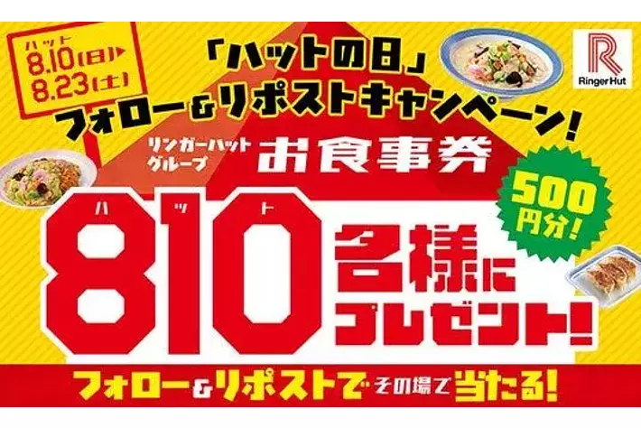 リンガーハット公式Xアカウントをフォローし、対象投稿をリポストすると、抽選で810名様にリンガーハットグループ共通お食事券が当たります。ハズレでもぎょうざ3個引換券が当たるお得なキャンペーンにぜひご参加ください。