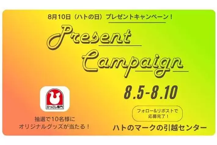 8月5日(火)~8月10日(日)に、「フォロー&リポストキャンペーン」を実施。ハトのマークの引越センターX公式アカウントをフォローし、対象投稿をリポストすると、抽選で10名様に「ハトのマークオリジナルグッズ」が当たります。