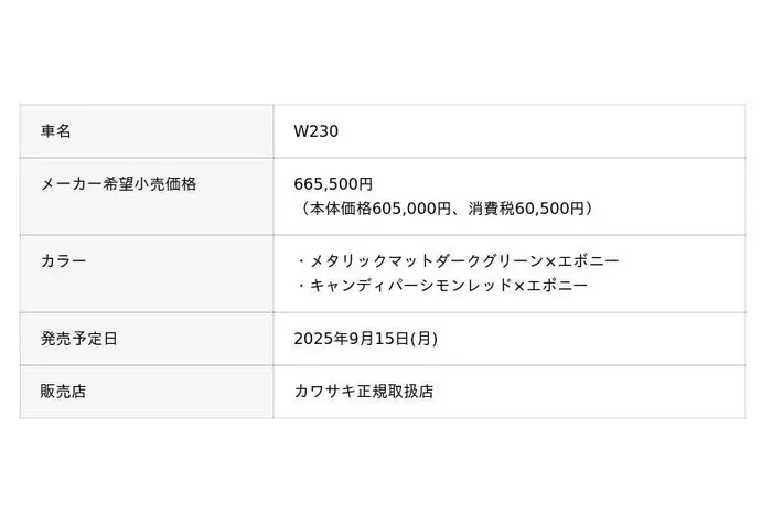 株式会社カワサキモータースジャパン(本社:兵庫県明石市、代表取締役社長:佐伯 健児)は、「W230」のカラー&グラフィックを変更し、2025年9月15日(月)に発売いたします。