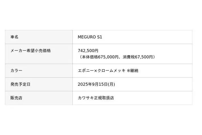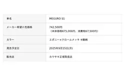 株式会社カワサキモータースジャパン(本社:兵庫県明石市、代表取締役社長:佐伯 健児)は、「MEGURO S1」を従来モデルのカラー&グラフィックを継続して、2025年9月15日(月)に発売いたします。