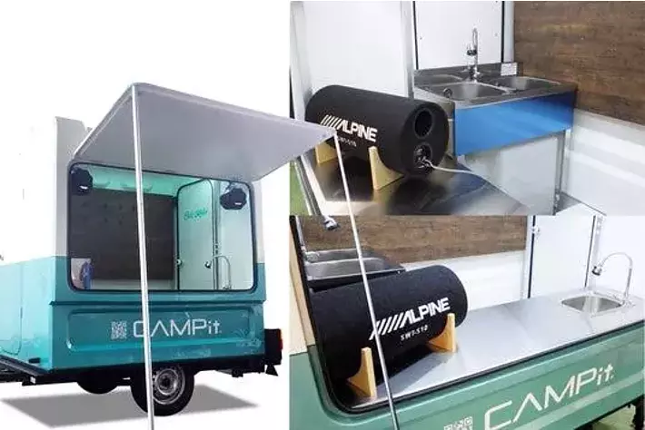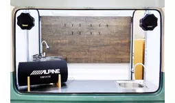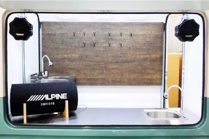 アルパイン海外仕様のスピーカーやサブウーファーを装備したキッチンカーとなっています