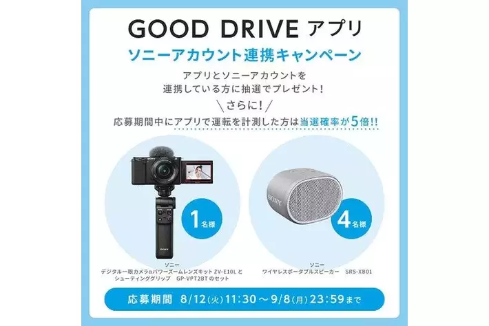 「GOOD DRIVE アプリ」とソニーアカウントを連携されている方を対象に、抽選で5名様に素敵な賞品が当たるキャンペーンを開催中です。