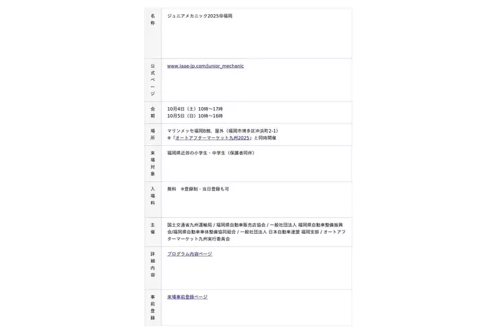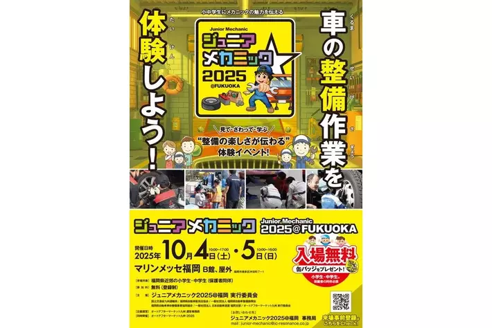 大好評につき今年も開催 小中学生向け自動車整備体験イベント『ジュニアメカニック2025@福岡』10月4日・5日in マリンメッセ福岡