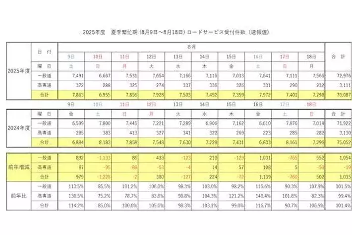 JAF(一般社団法人日本自動車連盟 会長 坂口正芳)は、お盆期間(2025年8月9日~8月18日まで)のロードサービス受付件数(速報値)をまとめました。