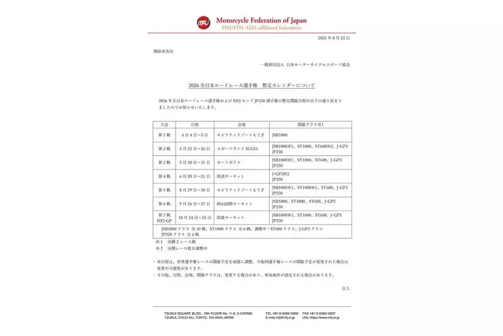 一般財団法人日本モーターサイクルスポーツ協会(MFJ)は、2026年の全日本ロードレース選手権の暫定カレンダーを発表いたします。2026年は全7戦、4月4日(土)~5日(日)に栃木県・モビリティリゾートもてぎにて開幕します。