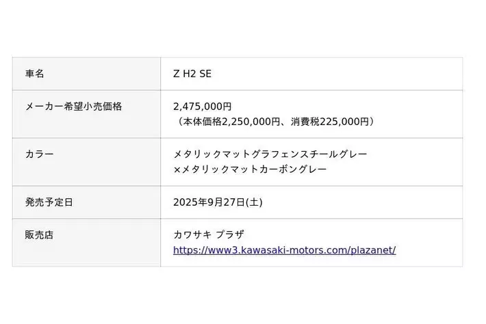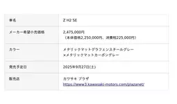 株式会社カワサキモータースジャパン(本社:兵庫県明石市、代表取締役社長:佐伯 健児)は、「Z H2 SE」のカラー&グラフィックを変更し、2025年9月27日(土)に発売いたします。