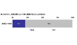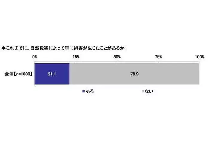 全回答者1,000名に、これまでに、自然災害によって車に損害が生じたことがあるかを聞いたところ、「ある」は21.1%、「ない」は78.9%となりました。