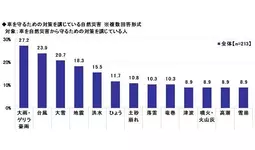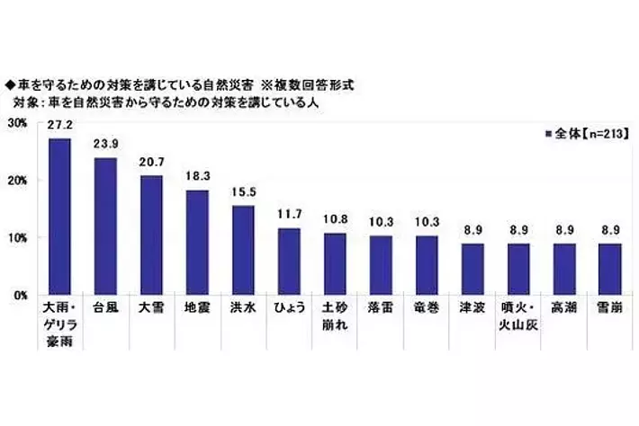 車を自然災害から守るための対策を講じている方213名に、車を守るための対策を講じている自然災害を聞いたところ、「大雨・ゲリラ豪雨」(27.2%)が最も多く、「台風」(23.9%)、「大雪」(20.7%)、「地震」(18.3%)、「洪水」(15.5%)が続きました。
