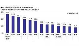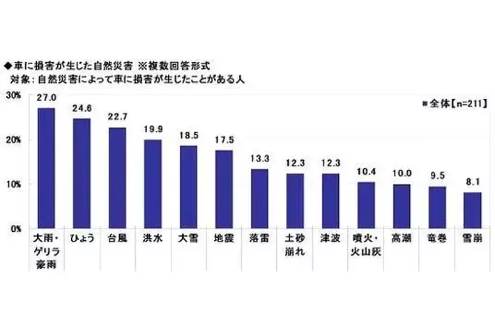 自然災害によって車に損害が生じたことがある方211名に、車に損害が生じた自然災害を聞いたところ、「大雨・ゲリラ豪雨」(27.0%)が最も多く、「ひょう」(24.6%)、「台風」(22.7%)、「洪水」(19.9%)、「大雪」(18.5%)が続きました。