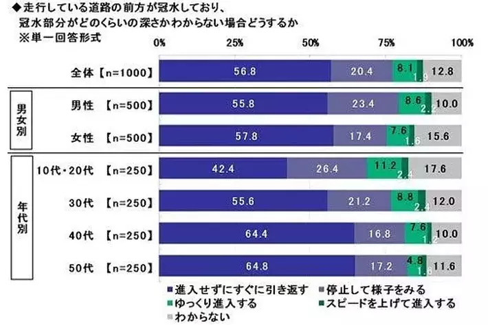 全回答者1,000名に、走行している道路の前方が冠水しており、冠水部分がどのくらいの深さかわからない場合どうするかを聞いたところ、「進入せずにすぐに引き返す」(56.8%)が最も多く、「停止して様子をみる」(20.4%)、「ゆっくり進入する」(8.1%)、「スピードを上げて進入する」(1.9%)が続きました。また、「わからない」は12.8%でした。
