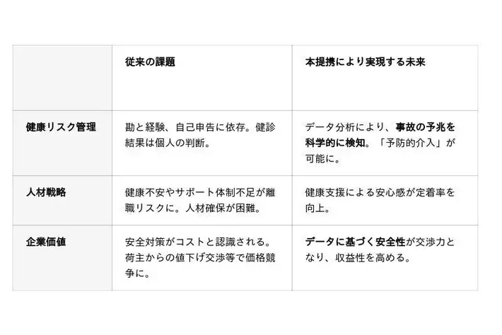 両社のビジョンと強みを結束し、ドライバーの高齢化や、いわゆる「2024年問題」と呼ばれる時間外労働の規制強化による輸送能力不足などの運輸業界が直面する課題に対し、「データに基づいた健康起因事故の予兆管理」という新たなアプローチで、事業の安全性と持続可能性に貢献します。