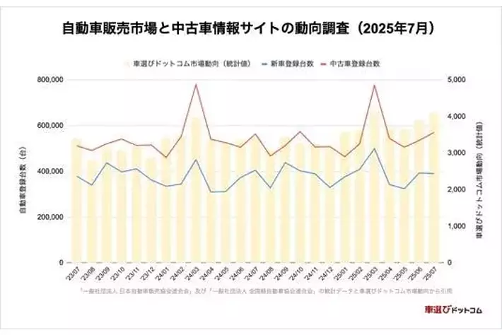 株式会社ファブリカホールディングス(本社:東京都港区、代表取締役社長CEO:谷口政人)の完全子会社、株式会社ファブリカコミュニケーションズ(本社所在地:愛知県名古屋市中区、代表取締役社長CEO:谷口 政人)が運営する中古車情報サイト「車選びドットコム(https://www.kurumaerabi.com/)」は、2025年7月の新車・中古車登録台数の推移および当サイトの販売台数推移をもとに中古車市場の動きをまとめた『中古車市場統計レポート』をご案内いたします。