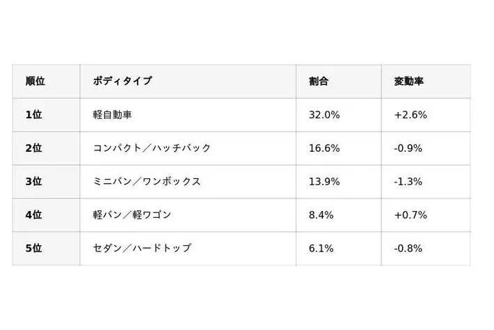 国産車のボディタイプ別ランキングでは、軽自動車が変わらず1位を維持しています。7月は軽自動車に属するボディタイプがシェアを伸ばしている一方で、その他ボディタイプがシェアを落としています。