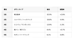 国産車のボディタイプ別ランキングでは、軽自動車が変わらず1位を維持しています。7月は軽自動車に属するボディタイプがシェアを伸ばしている一方で、その他ボディタイプがシェアを落としています。