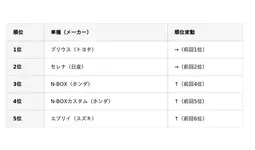 国産車の車種別ランキングでは、引き続きプリウス(トヨタ)が1位となりました。ボディタイプのランキングからも伺えましたが、7月は軽自動車の人気が高く、多くの軽自動車が順位を上げています。