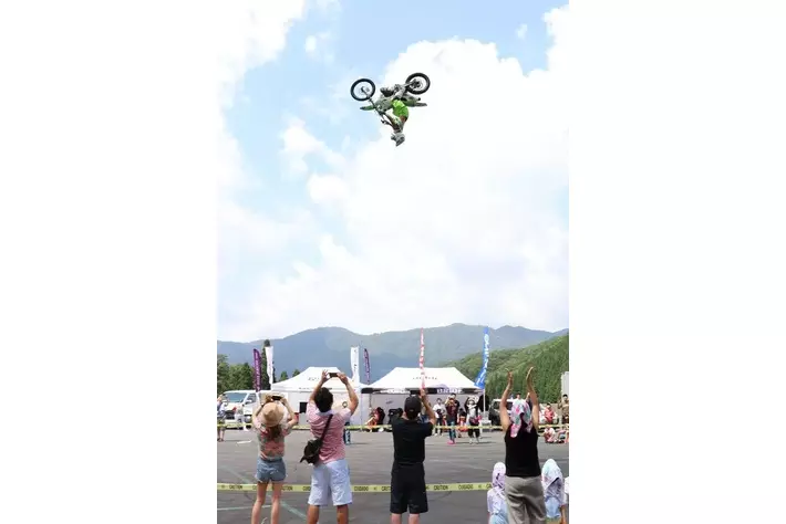 世界レベルのトップライダーがバイクで空中に飛び上がり「華麗なテクニックや超絶技」を披露する「FMX SHOWCASE」のバイクパフォーマンス。「誰もが驚く超絶パフォーマンス」でギャラリーを魅了します。