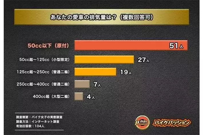 女性が乗車しているバイク「原付」が51人で最多!『50cc超~125cc』が続く