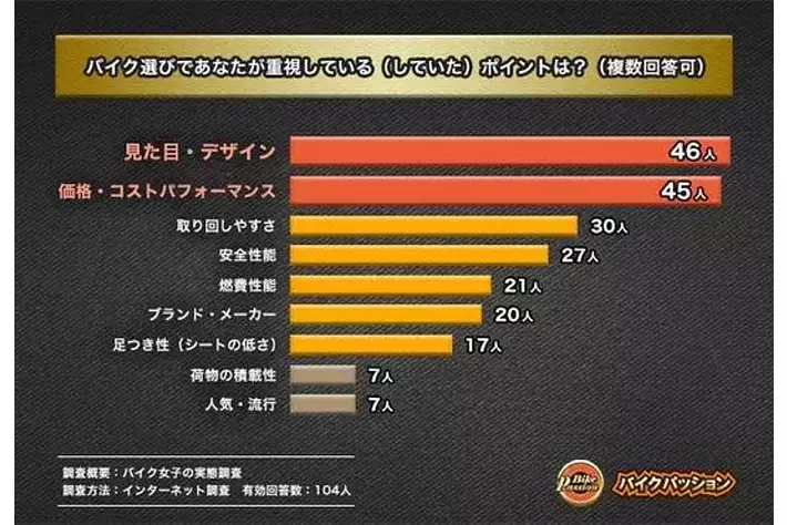 - 女性がバイク選びで重視するポイント『見た目・デザイン』が最多の回答に!『価格・コストパフォーマンス』が続く