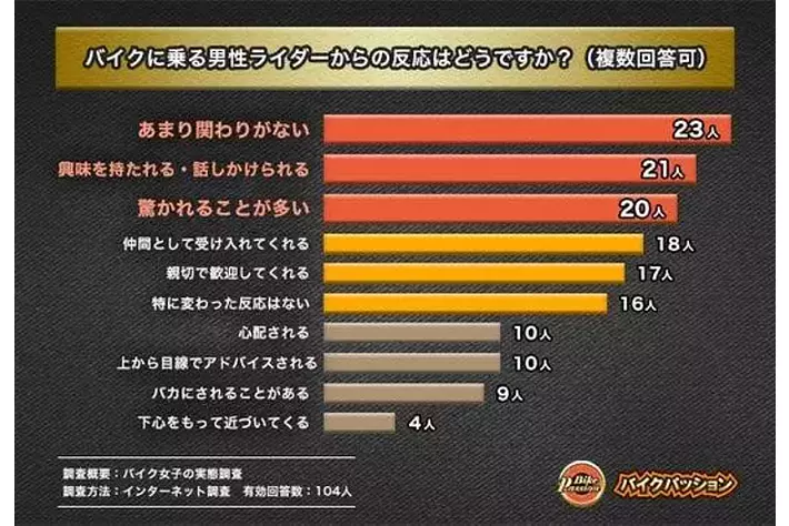 - 男性ライダーからの反応『あまり関わりがない』が23人で最多の回答に!続いて『興味を持たれる・話しかけられる』