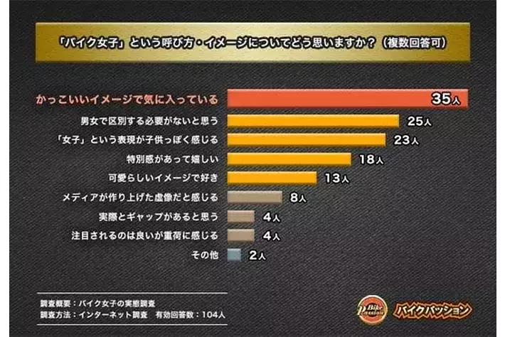 「バイク女子」に対するイメージ、『かっこいいイメージで気に入っている』が35人で最多に!一方で『男女で区別する必要がない』という声も
