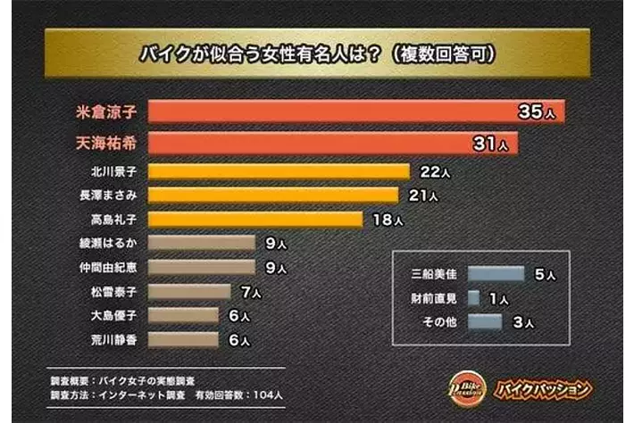 次に「バイクが似合う女性有名人は?」と質問したところ、米倉涼子さん(35人)が1位となりました。続いて天海祐希さん(31人)、北川景子さん(22人)、長澤まさみさん(21人)の順となっています。
