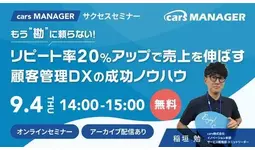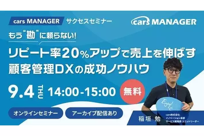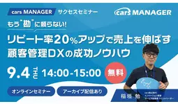 こうした背景を受け、cars株式会社は 自動車整備業界向け顧客管理DXツール「cars MANAGER」 を活用し、実際にリピート率20%アップを実現したノウハウを公開する「cars サクセスセミナー」を開催いたします。