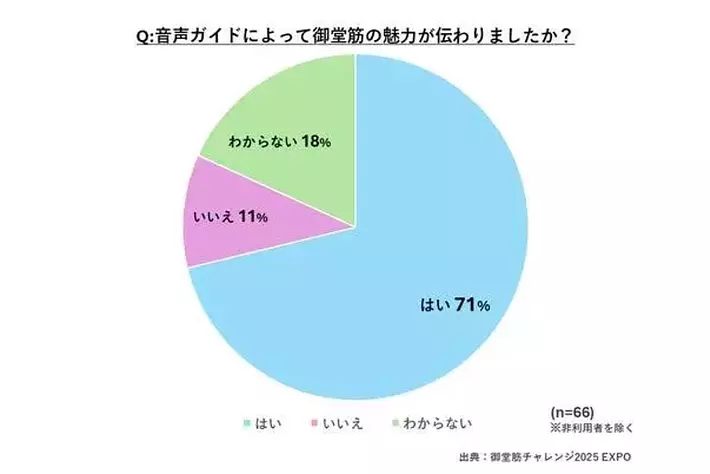 また、AI音声ガイド利用者のうち71%の方が「音声ガイドにより御堂筋を魅力的に感じた」と回答。AI音声ガイドはエリアの魅力度向上に一定の効果があることが確認できました。