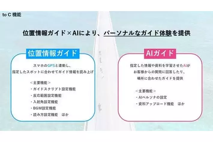 本イベントで提供した「CONIQ AI GUIDE(仮称)」は、トヨタ・コニック・プロとAtlas株式会社(本社:東京都渋谷区、代表取締役社長:宮崎 悠生)が共同で開発を進めています。スマートフォン端末の位置情報と連携した音声ガイドと、特定エリアの情報を学習させ、そのエリアに特化したAIによる質問回答などコンシェルジュ機能の提供が可能です。また、事業者自身でコンテンツを作成することが可能なダッシュボード機能(管理画面機能)も実装しており、低コストでの観光コンテンツ制作が可能です。