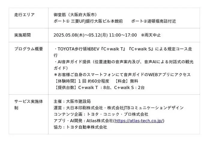 トヨタ・コニック・プロ株式会社(本社:東京都千代田区、代表取締役社長:武田 淳一郎、以下「トヨタ・コニック・プロ」)は、大阪・関西万博開催期間に大阪市が実施する、「御堂筋みちの未来体験EXPO」をテーマに、「はじまる、御堂筋」を合言葉とした、御堂筋で「みちの未来」を体験できるプログラム「御堂筋サテライトプラン」の第1弾:Art Walk御堂筋にて、周遊観光サービス「OSAMPO(おさんぽ)」で利用するAI音声ガイドコンテンツとして『CONIQ AI GUIDE(仮称)』を提供いたしました。