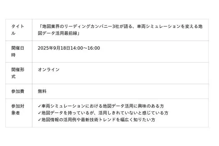 公式ページ: https://jp.mathworks.com/company/events/webinars/upcoming/insights-leading-map-companies-utilizing-maps-transform-vehicle-simulation-4941094.html?s_eid=PRP_1754589264