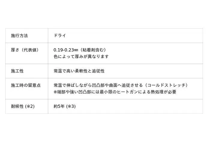 「3M(TM) プロテクションラップフィルム」は、3M独自の技術が複数採用されています。ラッピングフィルムのパーソナライズ性とペイントプロテクションフィルムの耐久性を組み合わせた自動車向けのハイブリッドフィルムであり、3M(TM) コントロールタック(TM) コンプライ(TM) 粘着剤の技術を採用することで、ペイントプロテクションフィルムでは珍しいドライ施工が可能となり、一般的なウェット加工に比べ施工時間が約1/2(※1)に短縮できます。