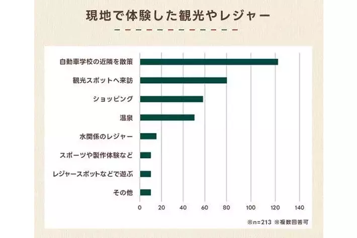 現地で体験した観光やレジャーを聞いたところ、最も回答が多かったのは「自動車学校の近隣を散策」で、約57%の人が体験しています。教習所によってはレンタサイクルなどのアクティビティを用意しているところもあり、普段はなかなか訪れない街を散策した人が多くいました。次いで、「観光スポットへ来訪」が約38%、「ショッピング」が約27%、「温泉」が約23%と並んでいます。空き時間を有効に活用して、その土地ならではの貴重な体験をした人が多かったようです。観光地に近い立地の教習所や、宿泊施設や教習所の近隣で温泉などが楽しめる教習所は人気であり、予約も早々と埋まってしまう傾向にあります。中には休校日を設けている教習所もあり、教習がなく1日空き時間となる休校日には、近隣の観光スポットを訪れたりレジャーを楽しむことができます。旅行気分を味わえる観光やレジャーは、慣れない教習から少し離れてリフレッシュでき、合宿生活にメリハリが生まれます。