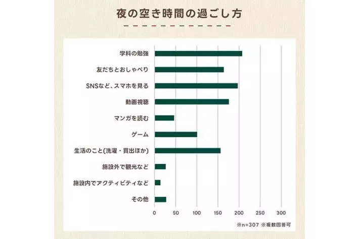 一方で、夜は勉強や会話の割合がやや減少し、「SNSなど、スマホを見る」や「動画視聴」など一人時間を楽しむ過ごし方が増加。さらに「洗濯・買い物などの生活のこと」を済ませる人が約半数にのぼり、夜のまとまった空き時間を有効活用している様子がうかがえました。