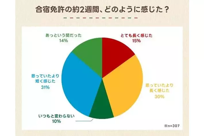 合宿免許の期間はおよそ2週間。決して短くはありませんが、「長い」と感じる人もいれば「短い」と感じる人もいて、その体感にはばらつきがありました。体感時間は、合宿生活での過ごし方や充実度、さらには個人の性格によっても左右されるようです。