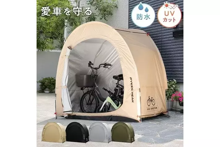 大切な愛車を守る高機能バイクガレージPYKES PEAK(パイクスピーク)のバイクガレージは、雨風・日差し・埃からバイクや自転車を守る屋外収納シェルターです。耐久性・撥水性に優れた高機能ポリエステル素材を採用し、PUコーティング加工で最大2,000mmの耐水圧を実現。さらに、シームテープ加工やUPF50のUVカット加工により、愛車の劣化や色あせを防ぎます。