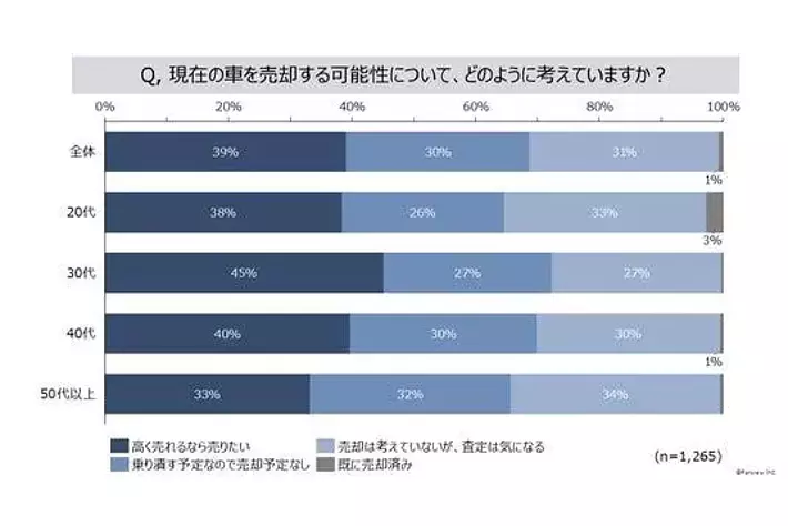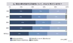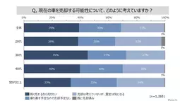 現在所有している車は、初年度登録をして「3~4年」経つ方が21%と最も多く、次いで「5~6年」が20%でした。今後の買い替え予定については、「しばらく買い替えない予定」が51%と最多ではあったものの、「半年以内に買い替える予定」3%、「1年以内に買い替える予定」5%、「2~3年以内に買い替える予定」21%と、今後買い替える予定がある方は29%であることが分かりました。現在の車を売却する可能性については、「高く売れるなら売りたい」が39%に対し、「乗り潰す予定なので売却予定なし」が30%と、売却を想定している方が多いようです。