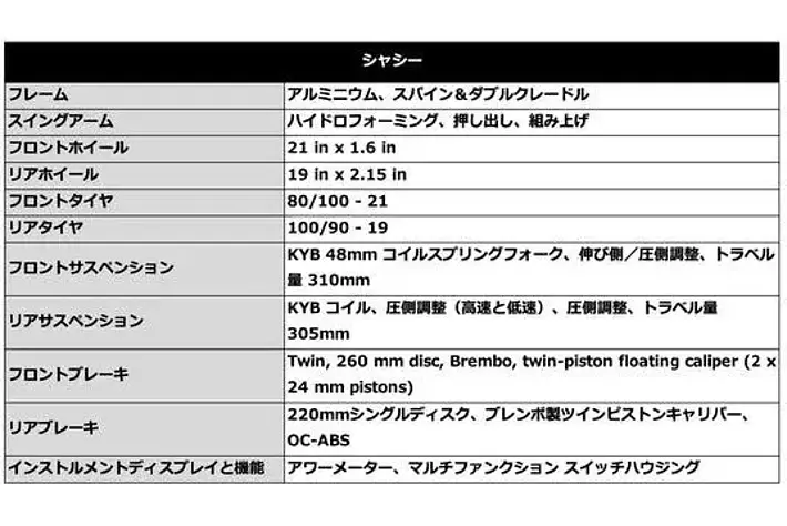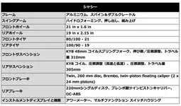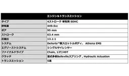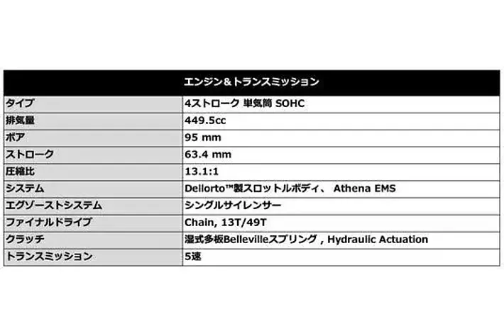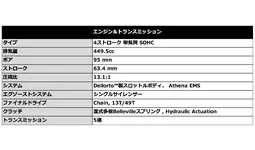 - 最高出力62.4PS/9,500rpmの450cc 4ストローク単気筒エンジンと108.3kgの軽量な車重により、クラス最高の出力と優れたパワーウエイトレシオを両立